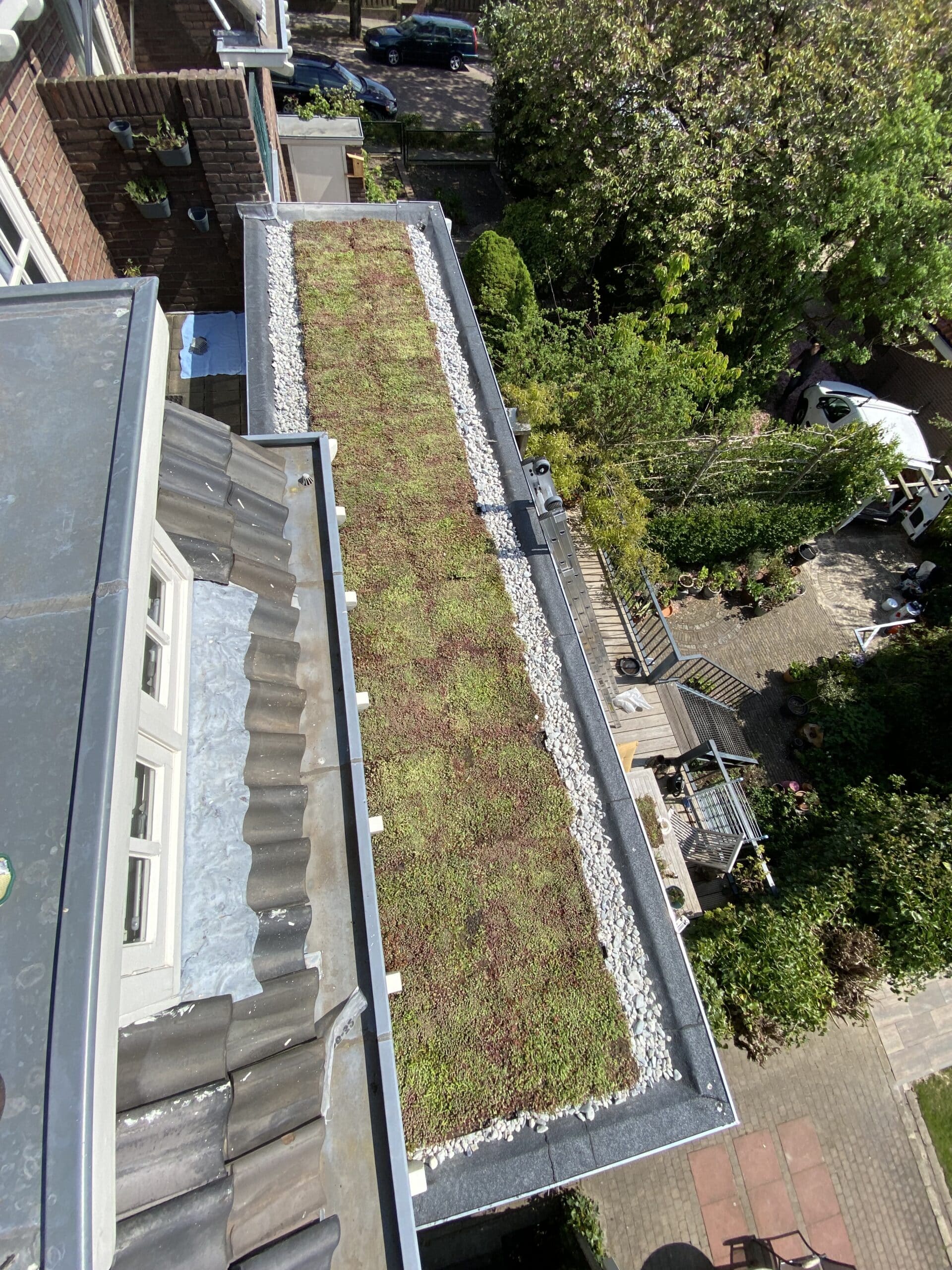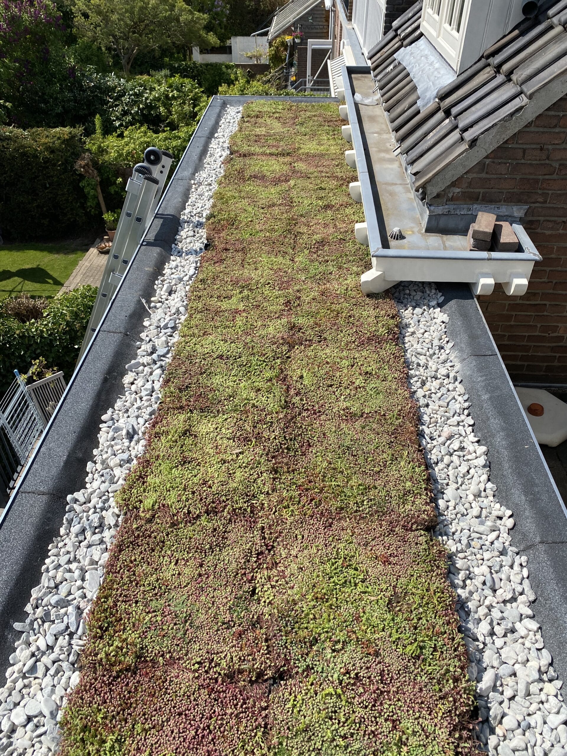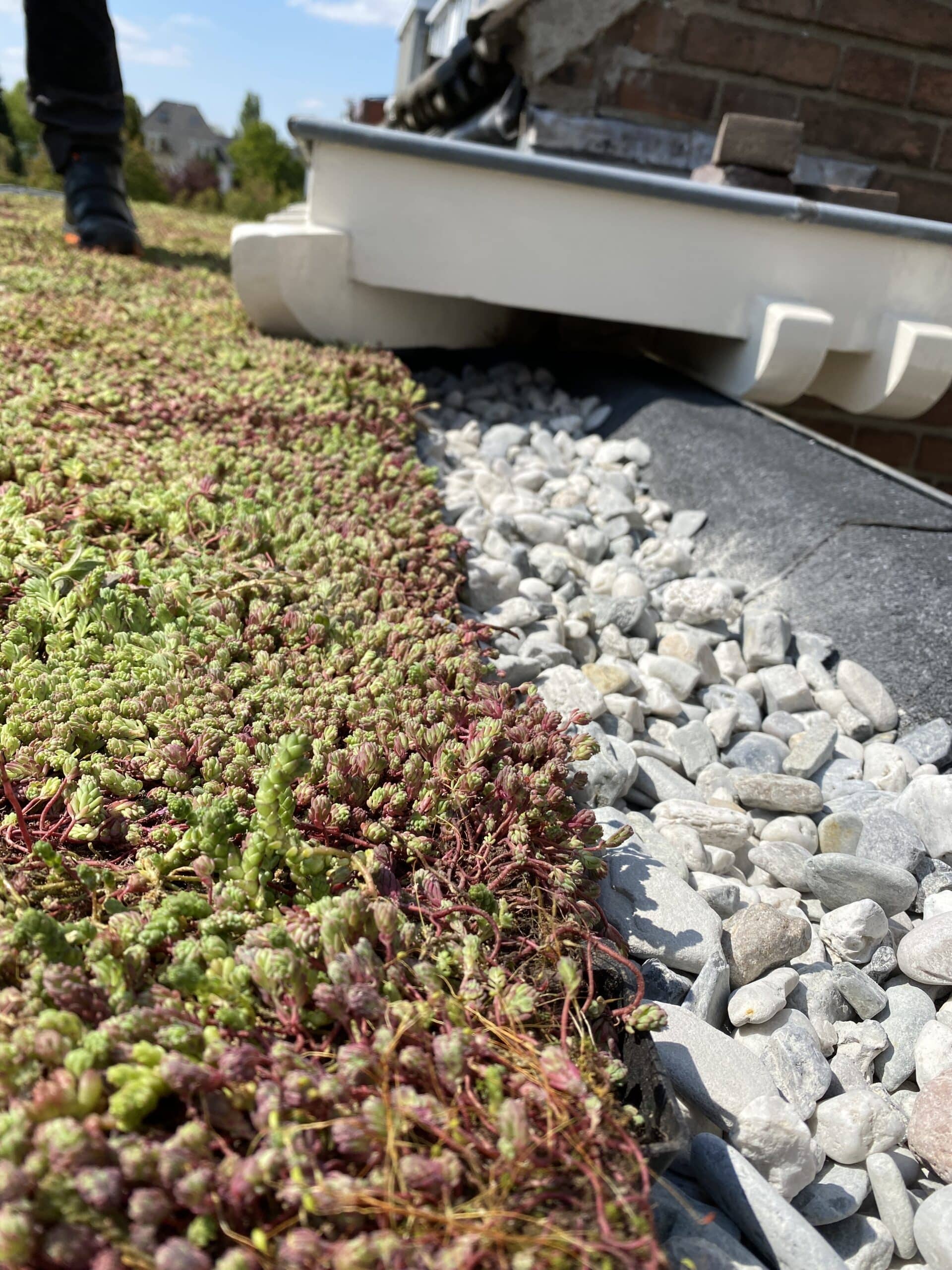 De oude dakbedekking is volledig verwijderd tot op het dakbeschot. Het dak is opnieuw opgebouwd met een onderlaag van bitumen en wortelwerende toplaag dakbedekking. Bovenop de dakbedekking is de sedum geplaatst in combinatie met grind om de het daksysteem te balasten.