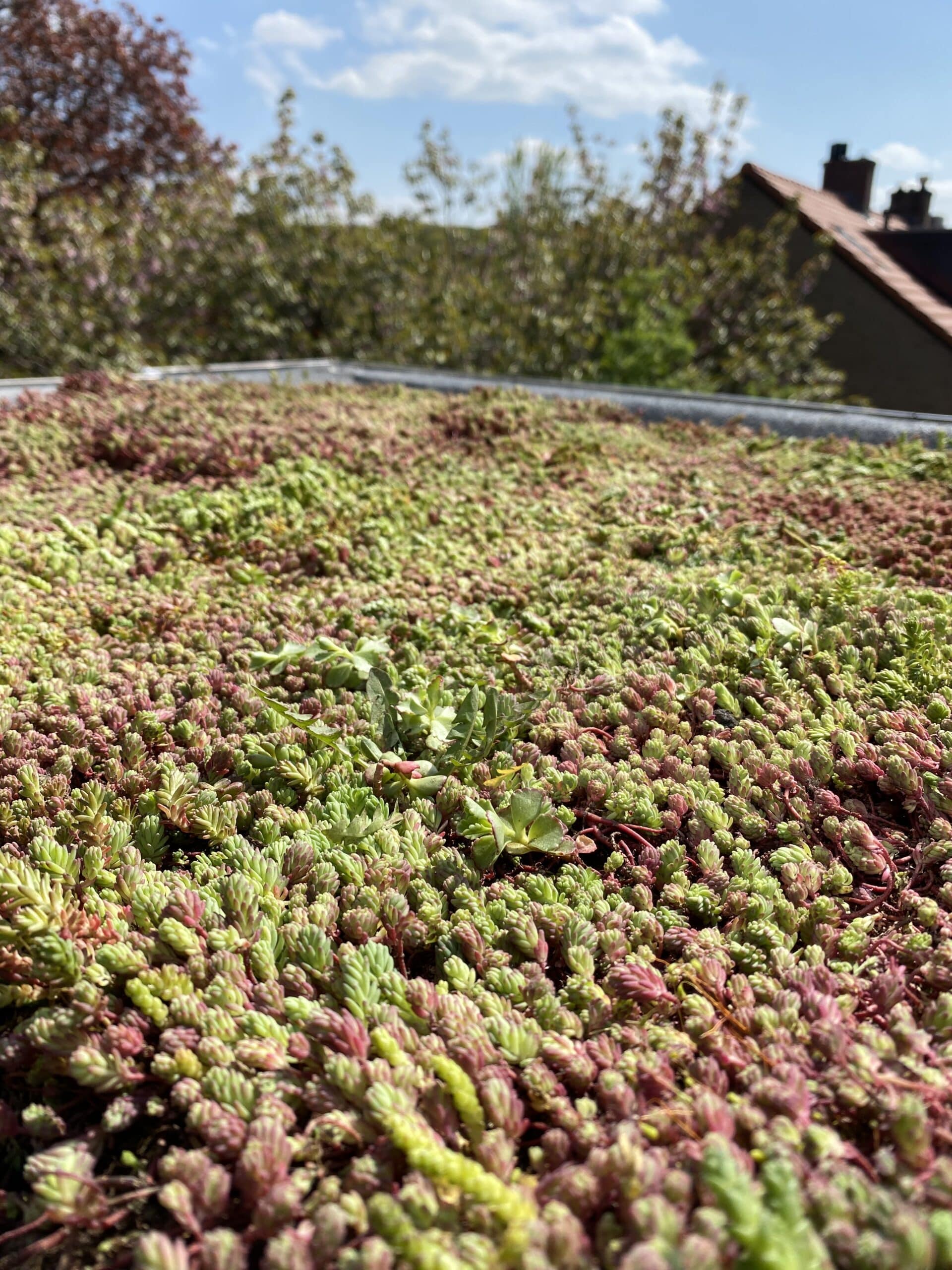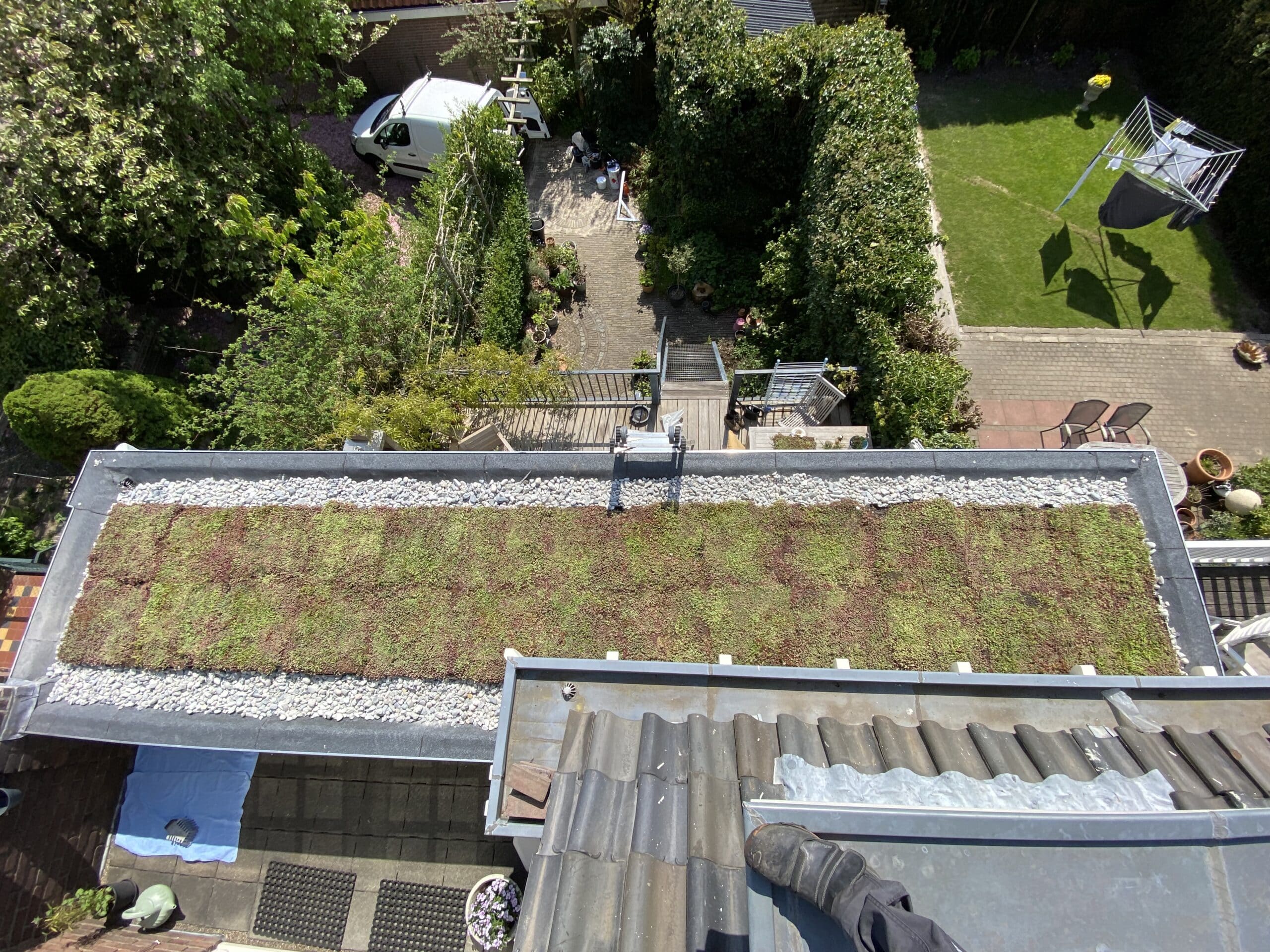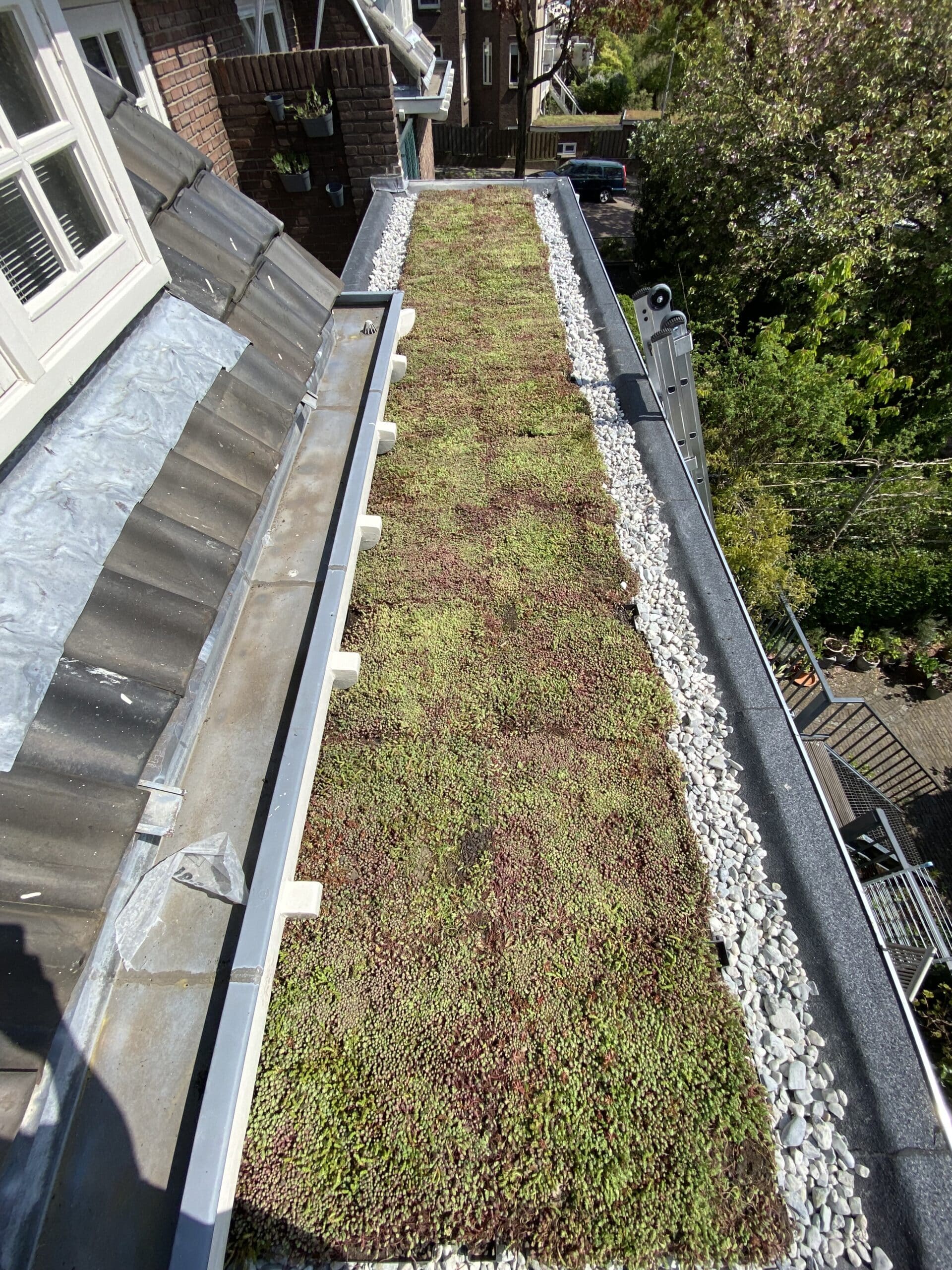 De oude dakbedekking is volledig verwijderd tot op het dakbeschot. Het dak is opnieuw opgebouwd met een onderlaag van bitumen en wortelwerende toplaag dakbedekking. Bovenop de dakbedekking is de sedum geplaatst in combinatie met grind om de het daksysteem te balasten.