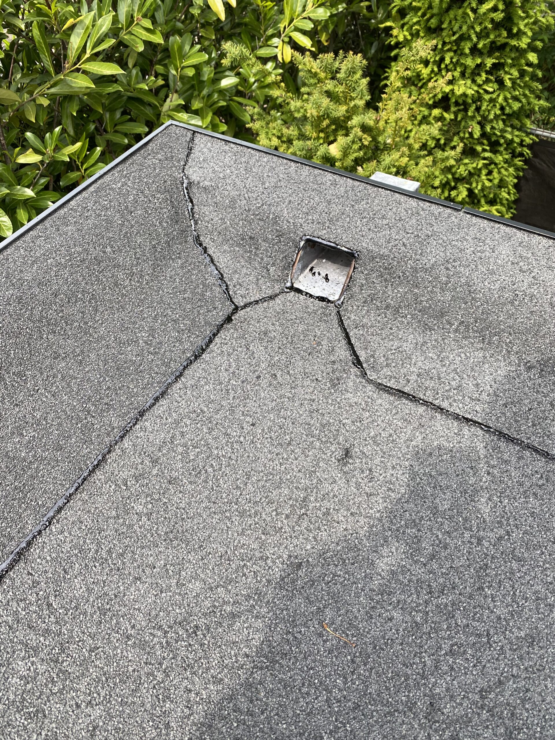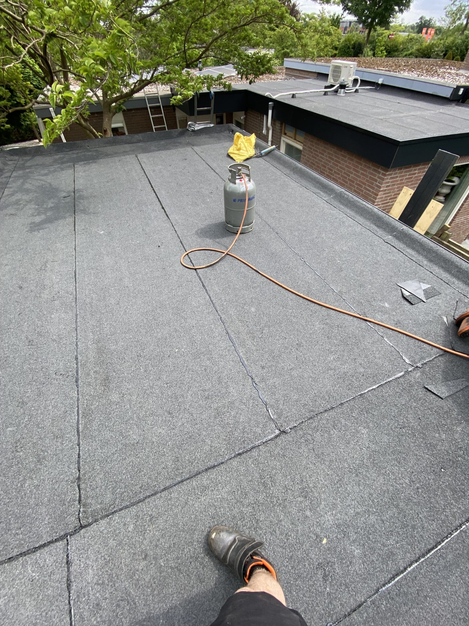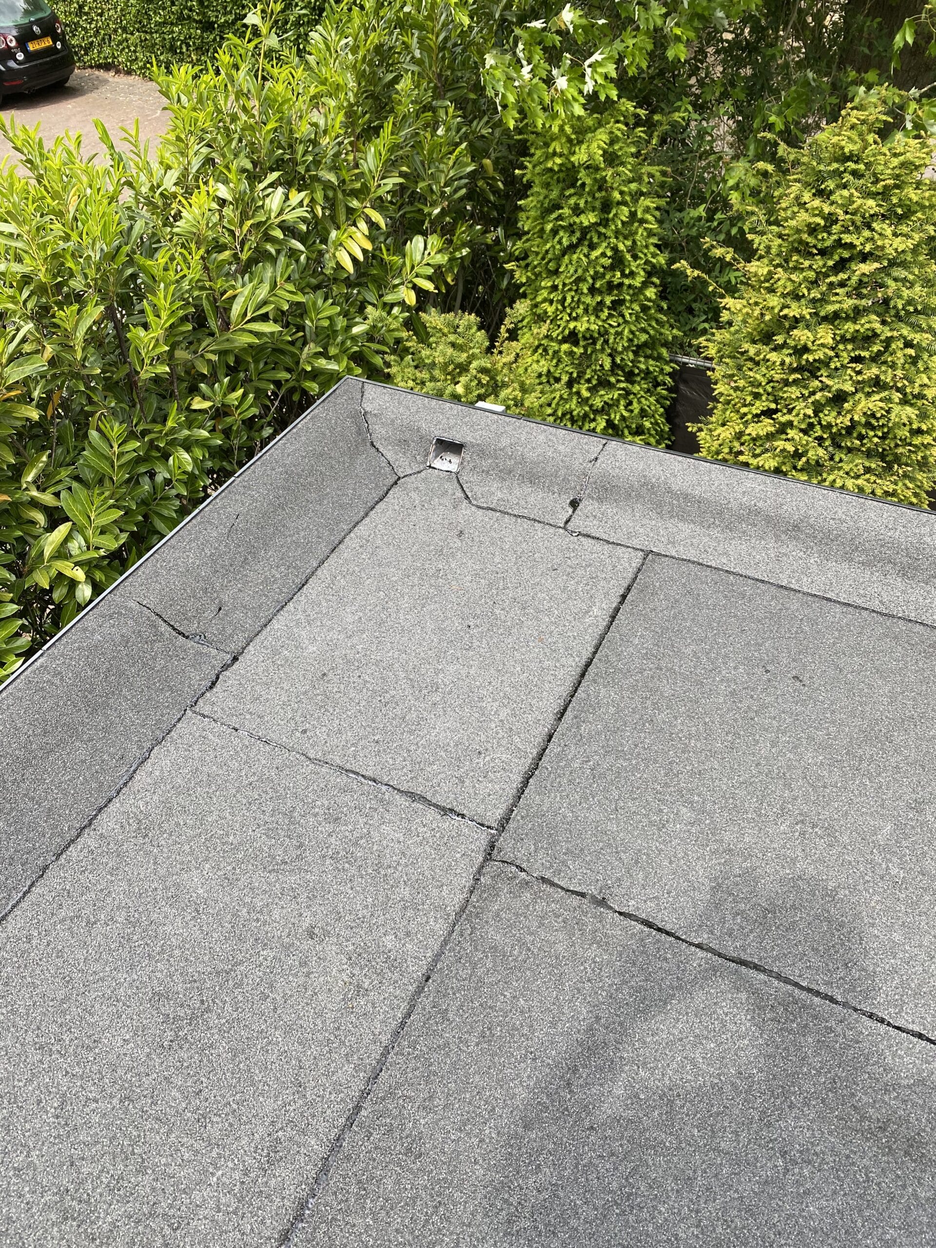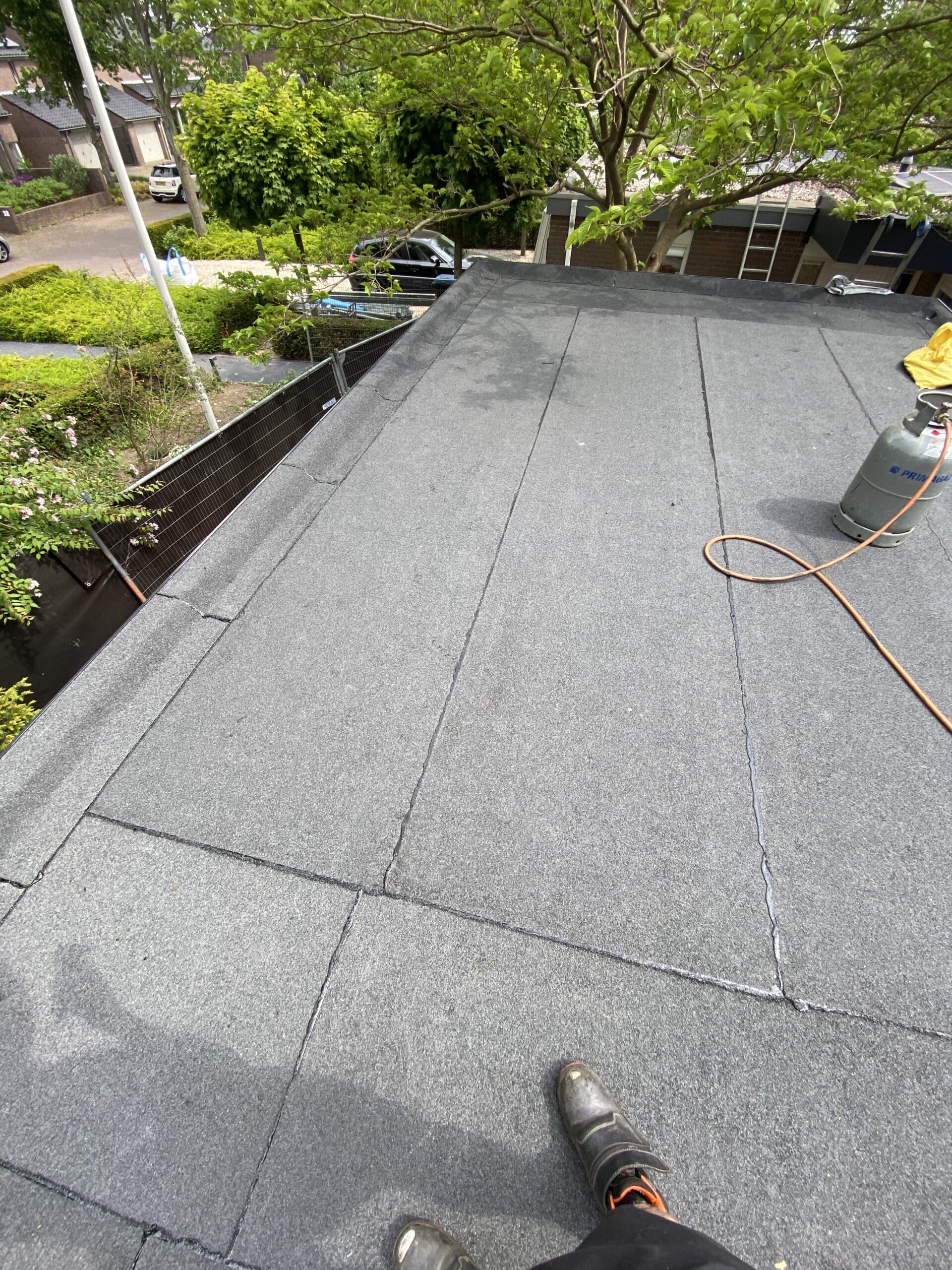 Voor het waterdicht maken van het platte dak van de garage is gekozen voor bitumen die afgewerkt is met grijze mineraal voor een langere levensduur.