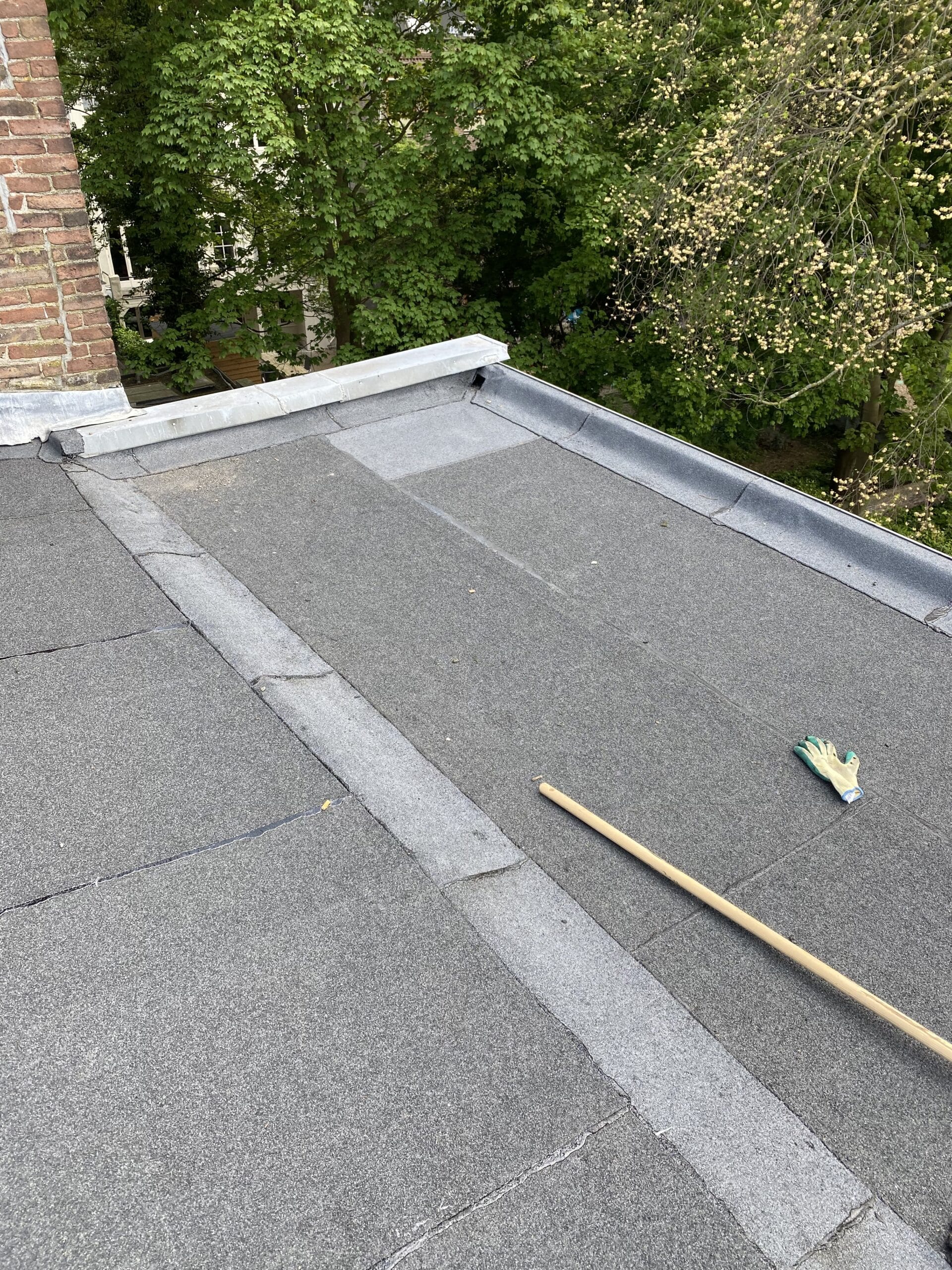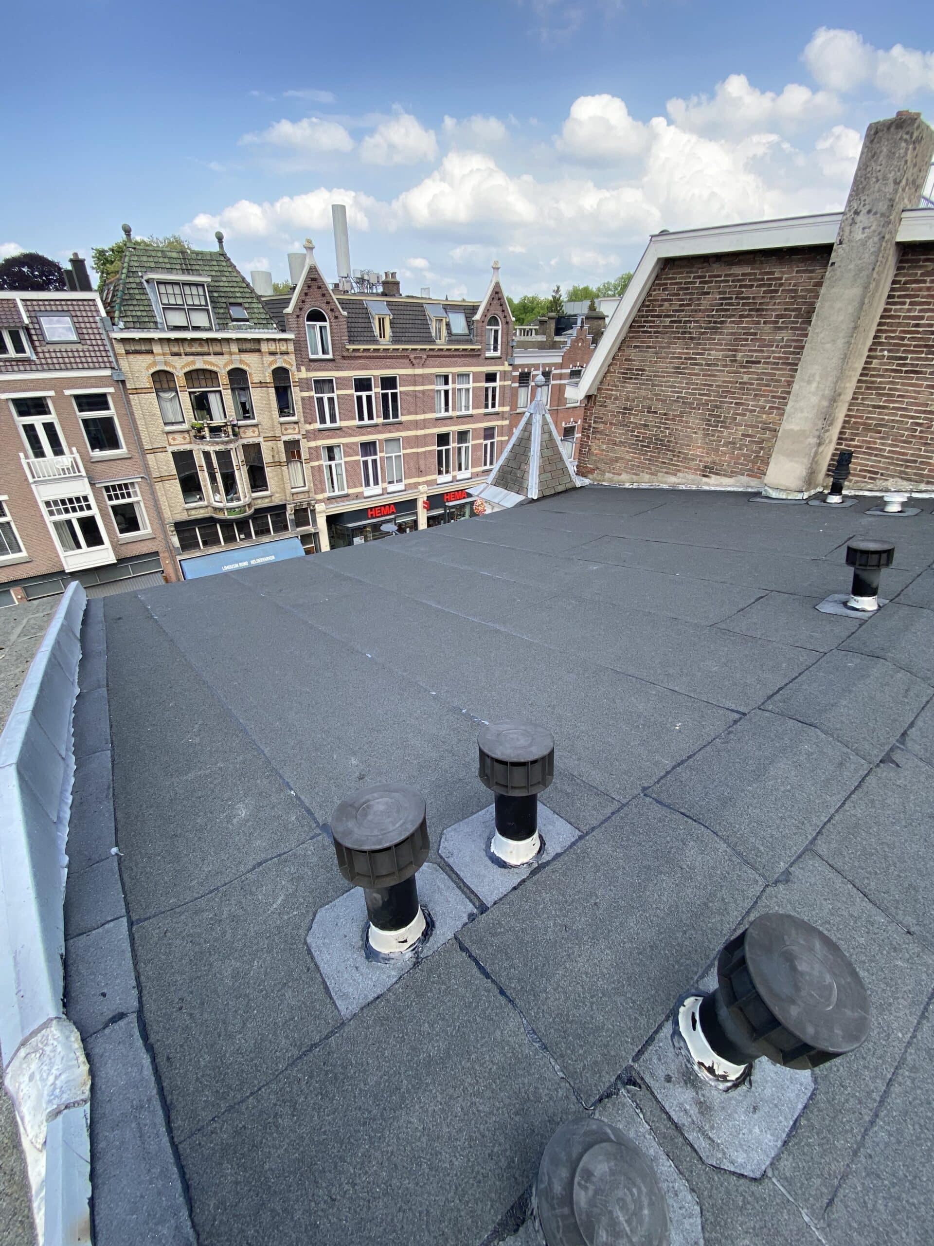 Het hellende bitumendak van een appartementencomplex was toe aan een volledige dakrenovatie. Naast de vernieuwde toplaag is het lood tegen de gevel vervangen en alle ontluchtingen vernieuwd.