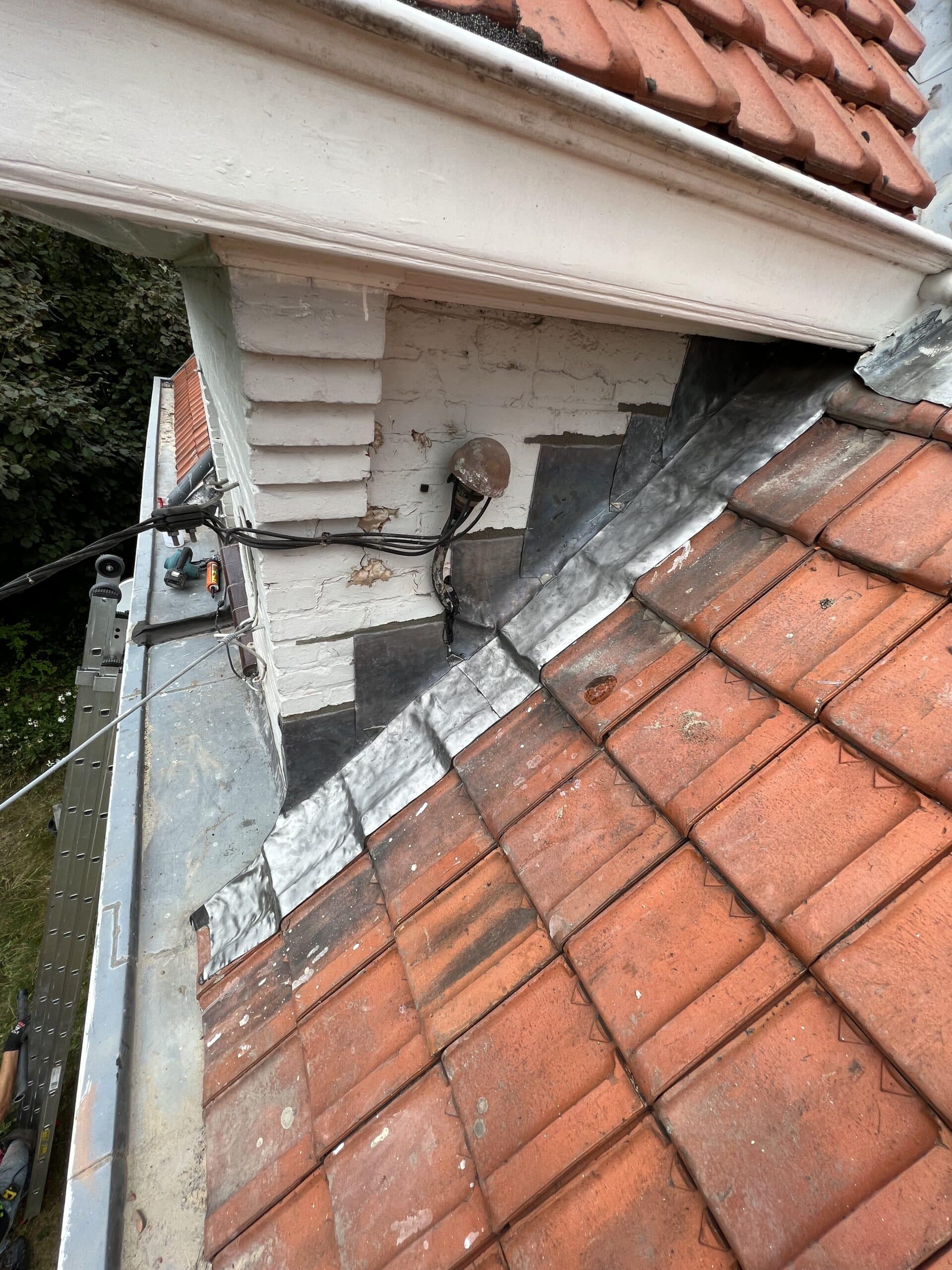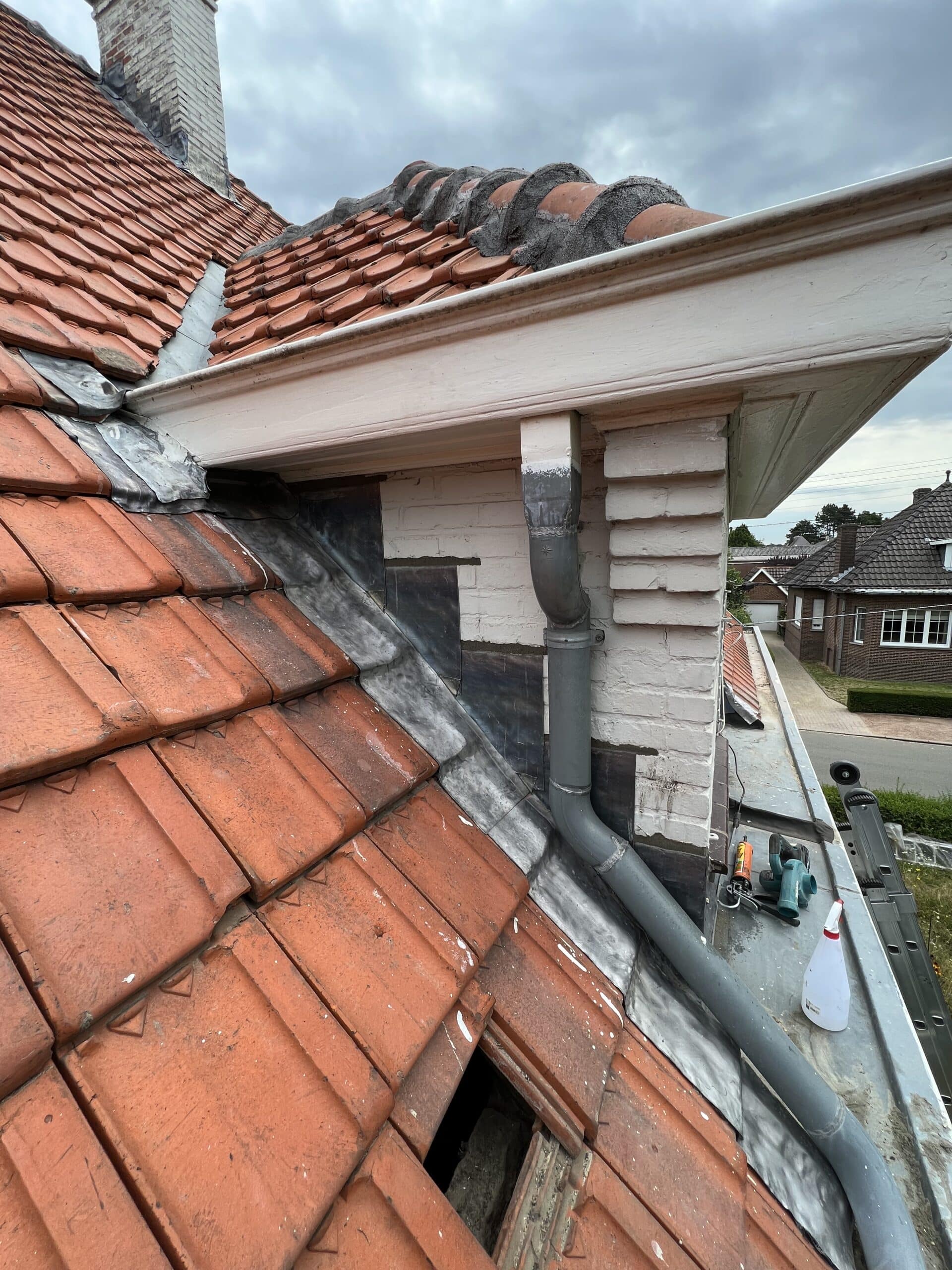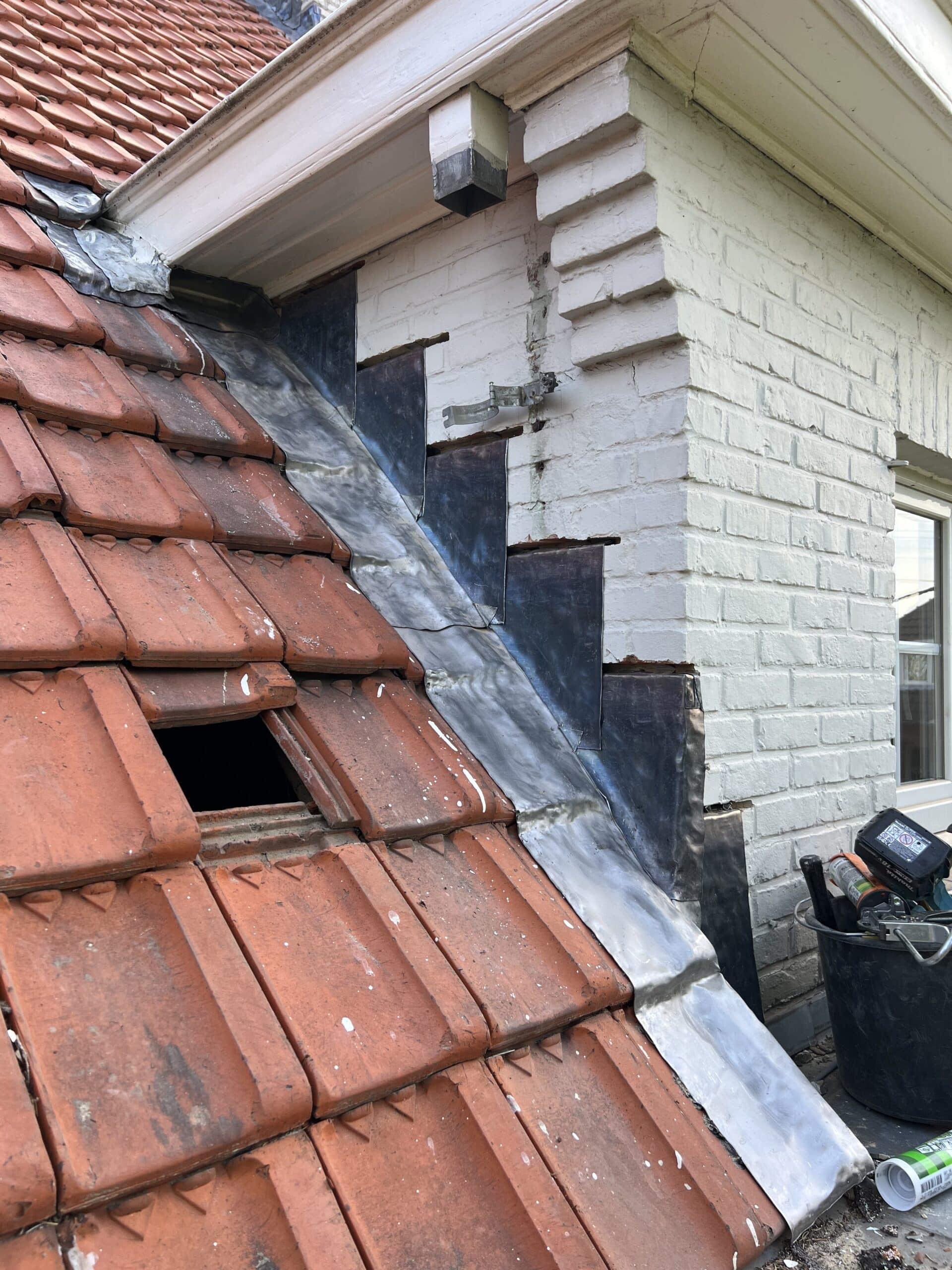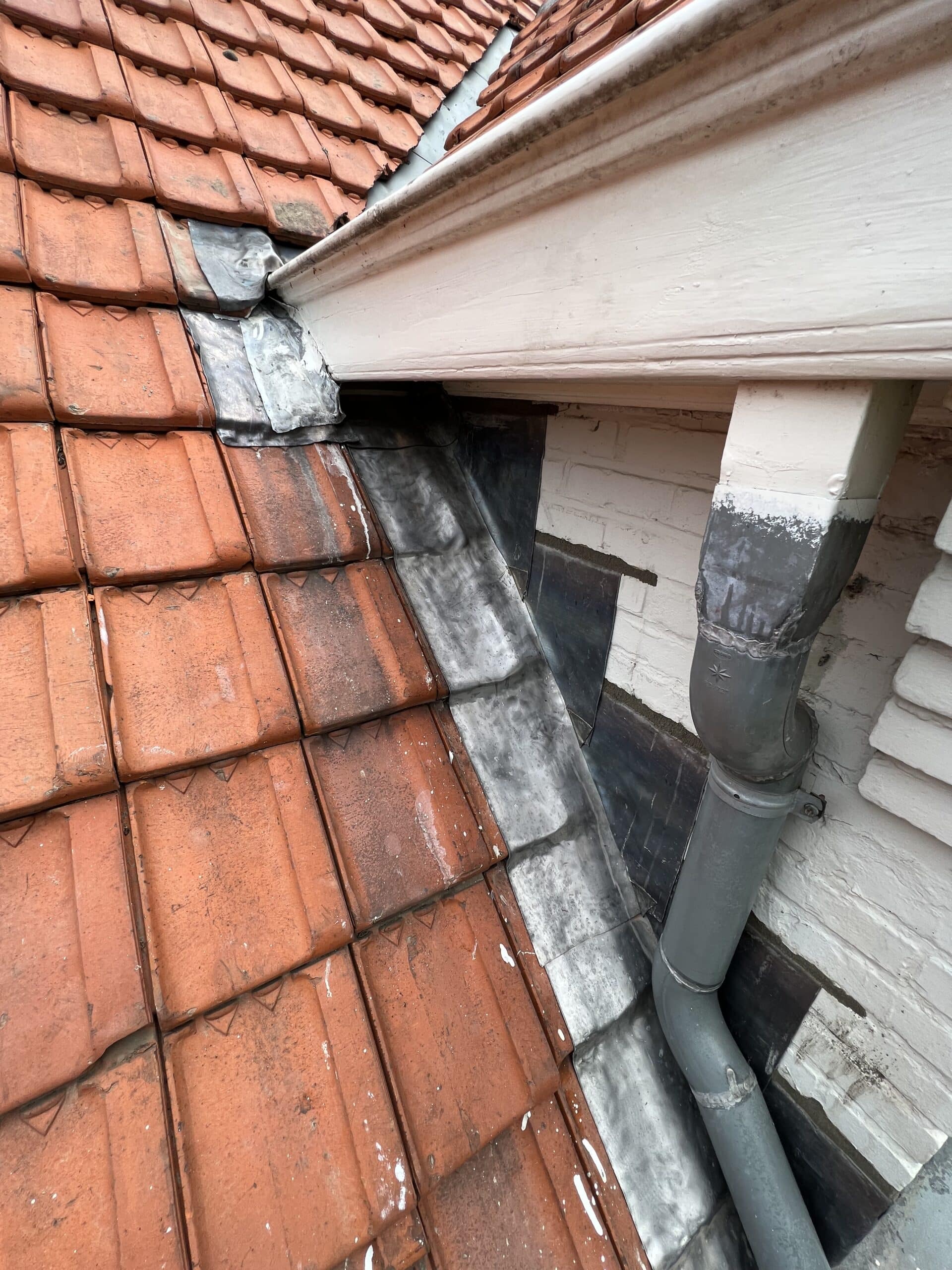 Het lood rondom de schoorsteen was sterk aan vervanging toe. Het oude lood is volledig verwijderd en de oude voegen zijn uitgeslepen. De nieuwe loodflappen zijn teruggeplaatst en lang genoeg gemaakt zodat deze netjes over de dakpannen heen vallen. De schoorsteen is opnieuw gevoegd en de aansluiting met het hellende dak is nu weer volledig waterdicht.