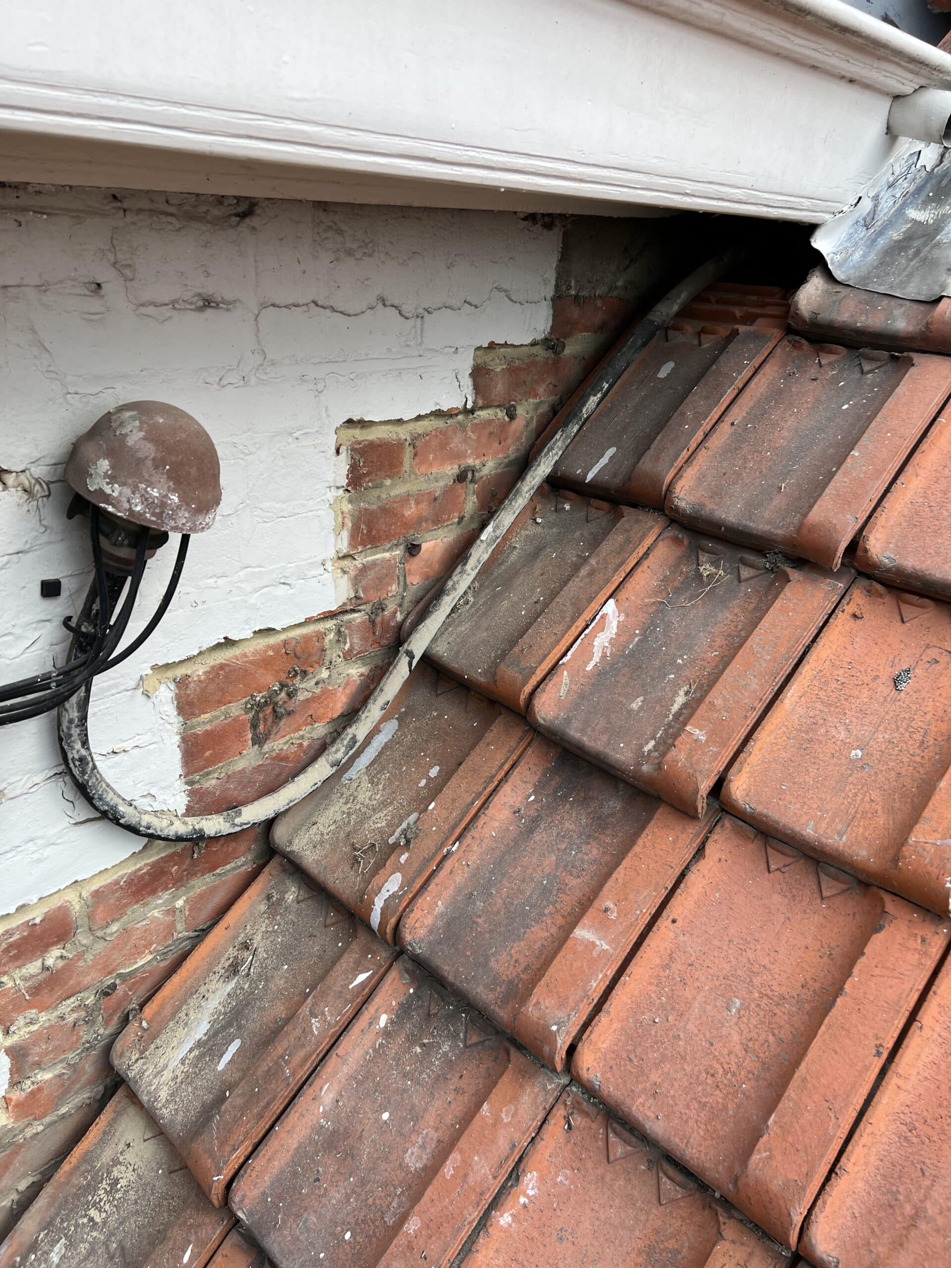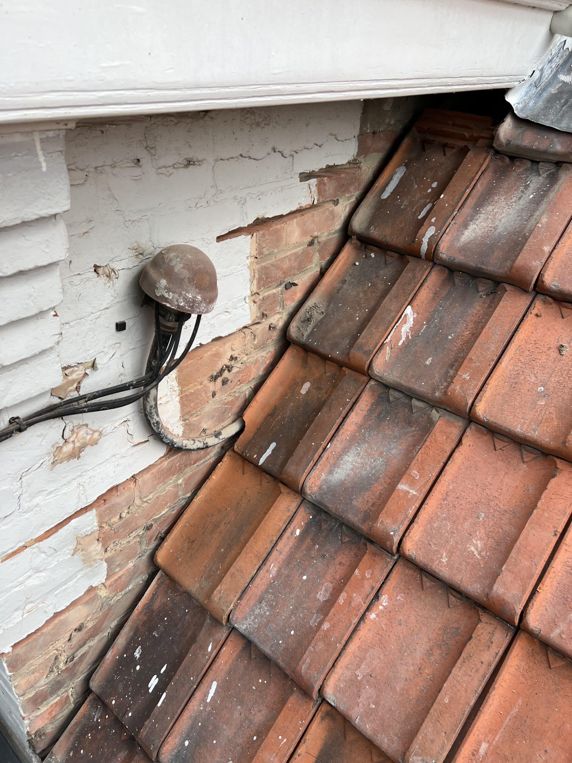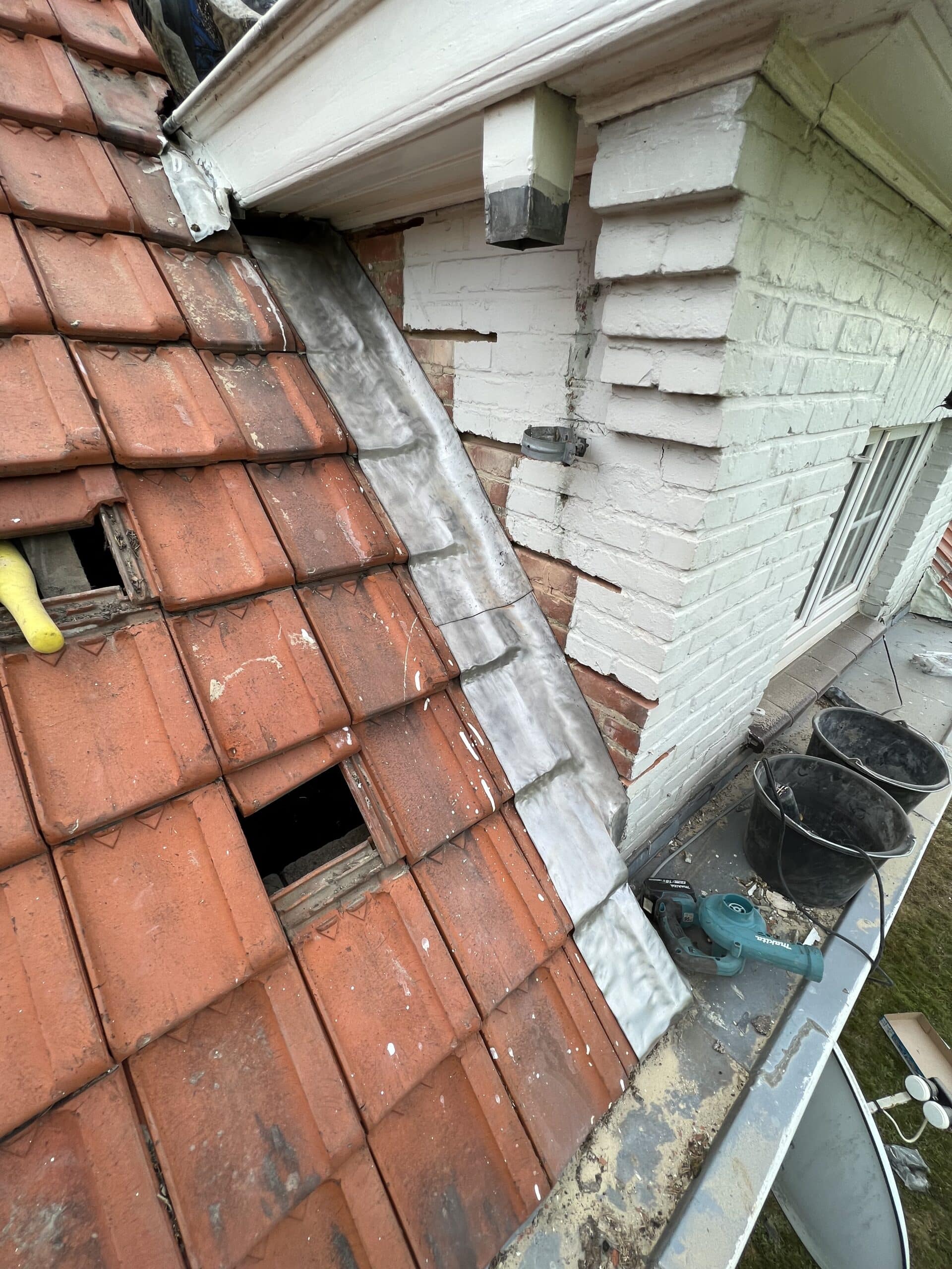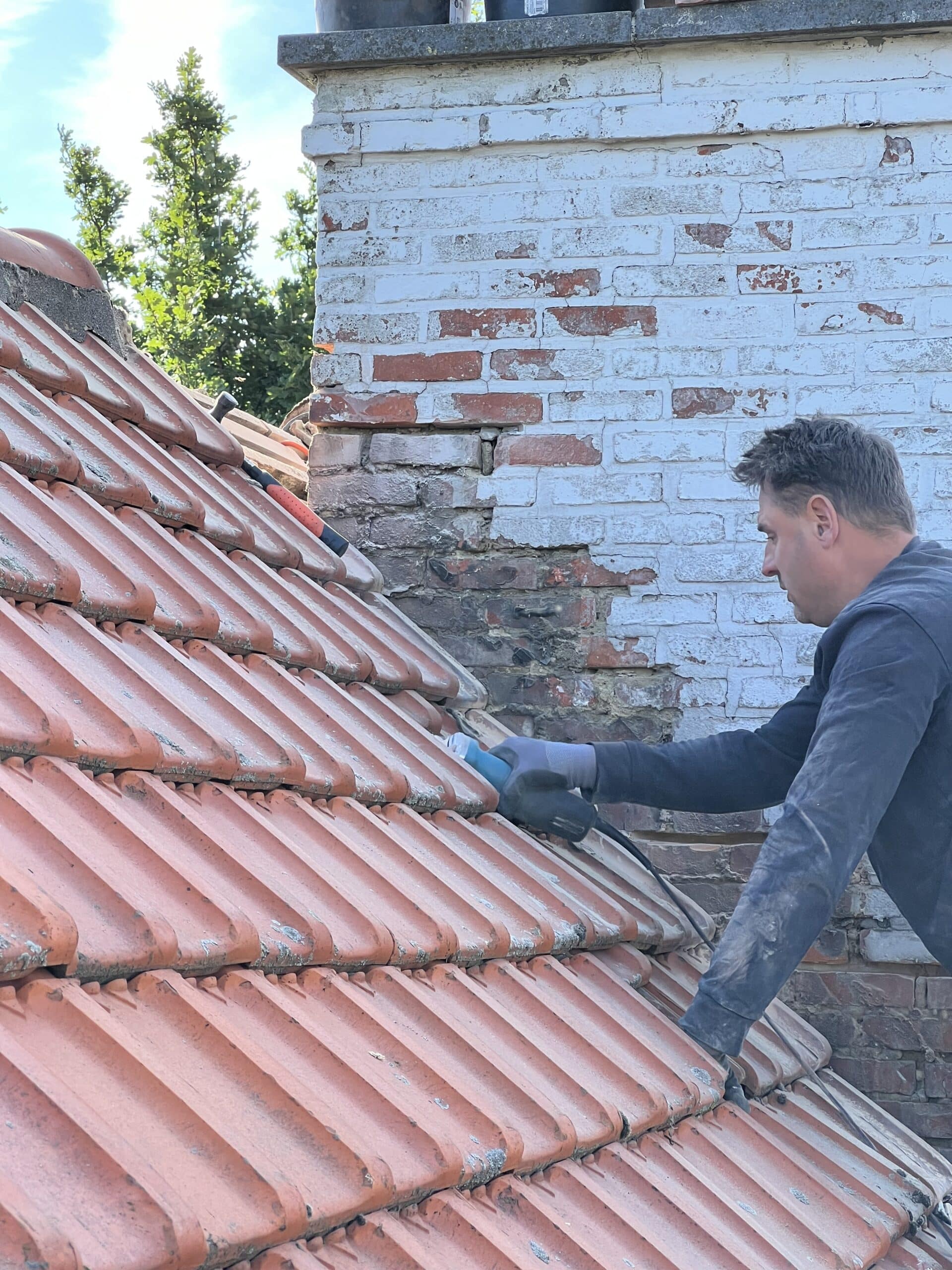 Het lood rondom de schoorsteen was sterk aan vervanging toe. Het oude lood is volledig verwijderd en de oude voegen zijn uitgeslepen. De nieuwe loodflappen zijn teruggeplaatst en lang genoeg gemaakt zodat deze netjes over de dakpannen heen vallen. De schoorsteen is opnieuw gevoegd en de aansluiting met het hellende dak is nu weer volledig waterdicht.